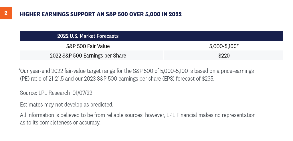 Despite the Fed’s accelerated tightening timetable, we continue to believe the S&P 500 will reach 5,000 in 2022. Earnings will have to do the heavy lifting to get us there with valuations elevated, though we believe a price-to-earnings ratio (P/E) in the 21–22 range is fair even if interest rates move modestly higher—that gets us to 5,000+ by year-end 2022.