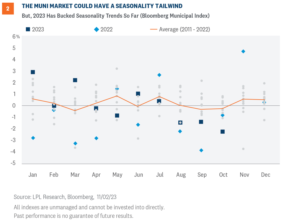 It’s been another volatile year for municipal (muni) investors this year. While generally outperforming U.S. Treasuries, the Bloomberg Muni Index is on track for its second calendar year of negative returns something that has never happened before. But, while volatility will likely persist over the coming months, we think muni investors may be able to catch a break, especially if the Federal Reserve (Fed) is done with its aggressive rate hiking campaign. Moreover, the next few months have historically been favorable for muni investors. So, with still solid fundamentals, the broader muni market may be in for a year-end rally, which would certainly be a nice reprieve for investors suffering from one of the worst muni drawdowns on record.