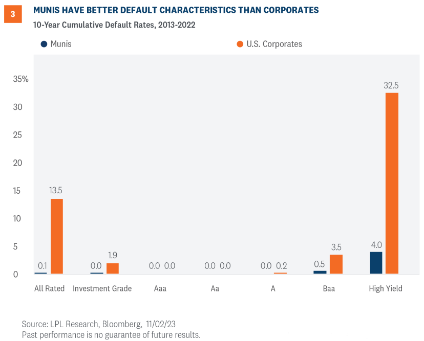 Earlier this year, rating agency Moody’s updated its historical default rate analysis between munis and corporates, and munis have, by far, better default characteristics. So, while investment grade munis have underperformed highly rated U.S. corporates so far this year (not tax-adjusted), munis tend to outperform corporate debt during economic slowdowns. Moreover, the default rate for munis is significantly better than corporate borrowers (Figure 3). The cumulative muni default rate for investment grade issuers (between 2013 and 2022) was just above 0% versus 1.9% for taxable corporate bonds. Additionally, the high yield muni credit default rate was around 4.0%, cumulative, versus 32.5% for high yield corporates.
