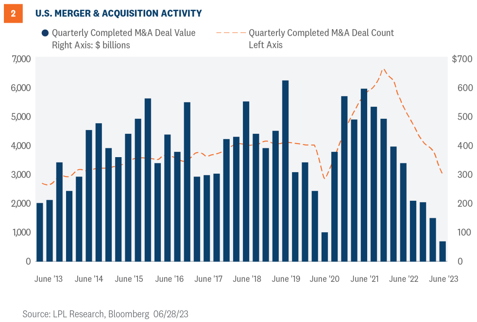 Similarly, merger and acquisition (M&A) activity has been hesitant as global central bankers continue to stress they will continue raising rates to quell inflation; however, as with the IPO market, deal flow has begun to pick up (Figure 2). Globally, approximately $1.22 trillion worth of deals have been executed year to date. Last year, deals for the first half of the year were valued at $2 trillion.
