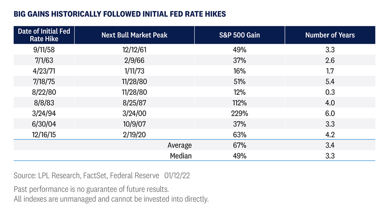But what does the hike mean further out, say 2023 and beyond? In Outlook 2022, we noted that initial Fed rate hikes can help us mark where the economy is in its cycle. The start of rate hikes typically happens in the early-to-middle stages of the cycle, where stocks historically see solid gains as we are forecasting for 2022.