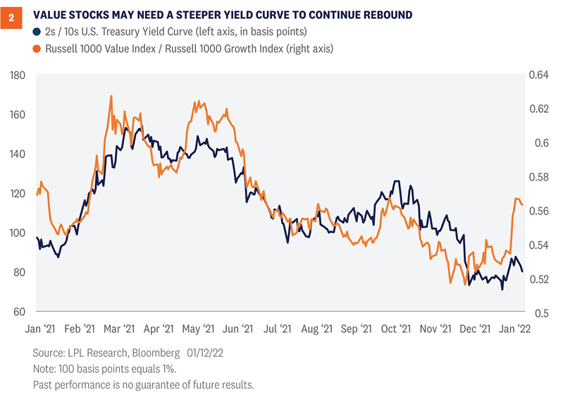 As shown in [Figure 2], the relative strength of value stocks has been closely tied to the yield curve, or the difference between 2-year and 10-year U.S. Treasury yields. A steeper yield curve tends to be good for financials, the biggest value sector, so this makes sense.
