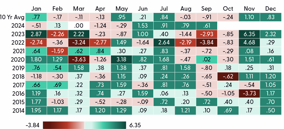 While we wait for the presidential election to play out, muni investors may have to wait a few more months before potential seasonal headwinds abate. Generally, after the summer doldrums, new issuance tends to pick up with September and October as heavy supply months. In the 10 years from 2014 to 2023, September and October ranked highest among average tax-exempt municipal supply months, as issuers sought to complete borrowing plans ahead of the winter holidays. The increase in supply has generally put downward pressure on prices (upward pressure on yields) with September being the most challenging month. Of the past 10 Septembers, only three have generated positive returns for the index. October has been slightly better, with four out of 10 Octobers generating positive returns. However, average tax-exempt supply typically falls to below-average levels from November to January. The reduction in supply has tended to be good for muni returns. Since 2014, the average return for the muni index has been positive from November through January. The silver lining? If history repeats, bond yields may stay elevated, giving muni investors another opportunity to lock in current yields before yields potentially fall throughout the Fed’s rate cutting cycle.