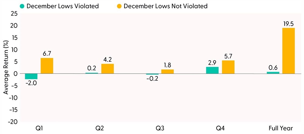 S&P 500 Returns if December Lows Fail or Hold in Q1 (1950–2025)