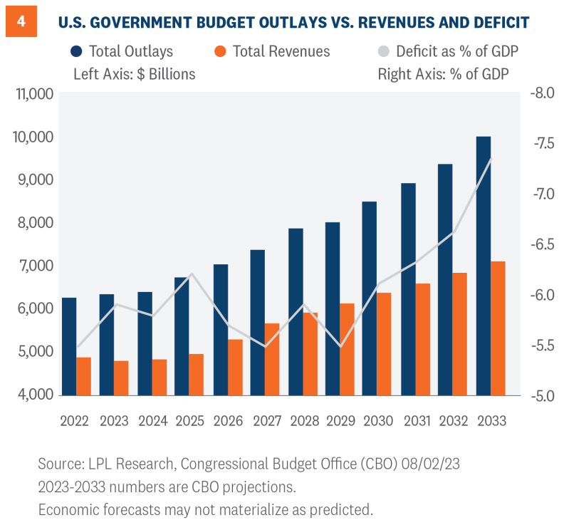Allowing the deficit to expand at the current pace would bring into question the ability of the government to fund the benefit programs that the average citizen has paid into during their working years. Projections by the non-partisan Congressional Budget Office (CBO) for the next 10 years reveal just how dramatically the deficit could rise if the U.S. remains on its current path of, dare we say, fiscal profligacy (Figure 4). If tax revenues continue to trail government outlays, the deficit as a percent of GDP could jump another 2 points over the next 10 years at a time when the debt could be as expensive to service as its been in several decades.