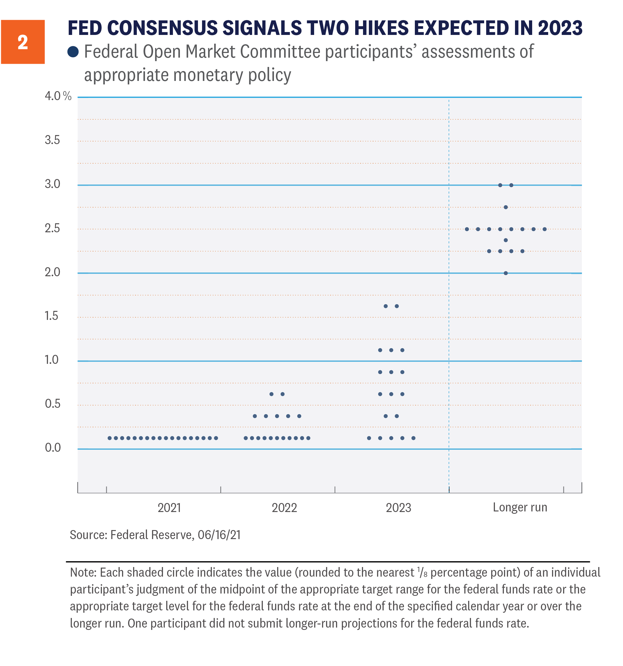 The Fed ended its two-day Federal Open Market Committee (FOMC) meeting last week and, as expected, there were no changes to its current interest-rate or bond-purchasing policies. However, signaling on the future path of short-term interest rates seemingly surprised markets because the number of Fed members who now expect interest-rate hikes in 2023 changed dramatically, relative to the last FOMC release. While an initial rate hike was once thought of as a 2024 event at the earliest, as seen in chart below, the majority of members now expect at least two quarter-point interest-rate hikes to take place in 2023. Additionally, seven members (out of 18) expect at least one rate hike in 2022.