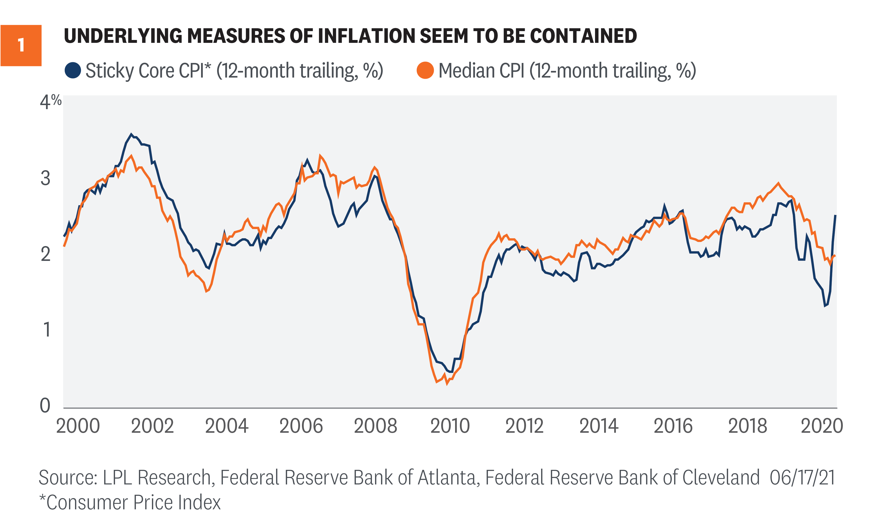 Inflation is certainly still capable of coming in hotter than expected. The difference between now and earlier this year is that inflation expectations are already elevated. In order to see inflation assets really perk back up, we would probably need to see stronger signs that higher inflation may be persistent. To get a read on that, it may be better to look at prices that tend to be more stable. We know there are areas where we’re seeing extreme price moves, which is impacting broader measures of inflation. But what about prices that tend not to move? There is such a measure, developed by the Federal Reserve Bank of Atlanta, called sticky core inflation.