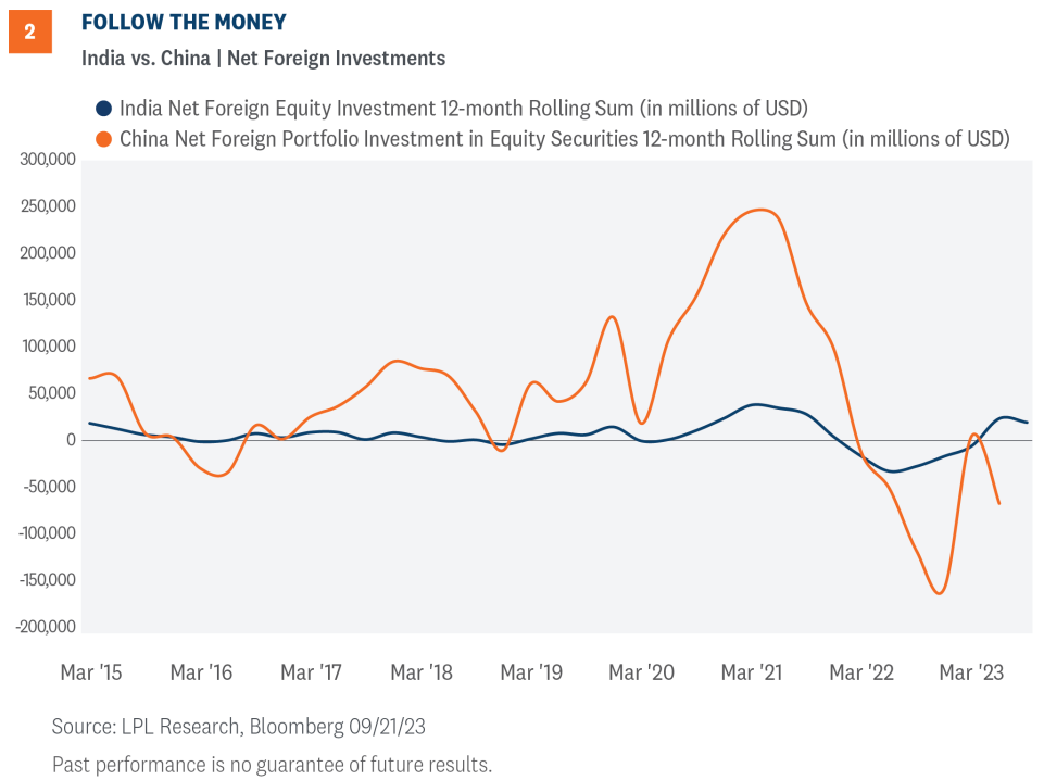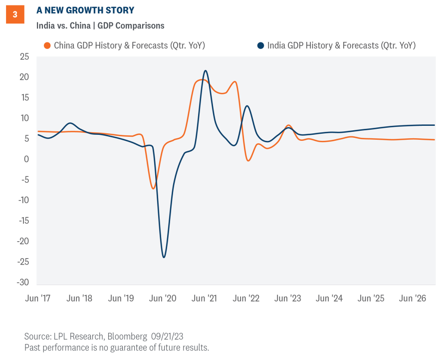 India has emerged as a compelling economic growth story and an increasingly attractive alternative to China within the emerging markets complex. A growing population with a robust and young workforce, significant infrastructure spending, and an ongoing digital transformation have been key catalysts to India’s outperformance over China. India has also benefited from the de globalization trend as manufacturers move production away from China. While we may not go as far as officially calling India the new China, the economic and technical trends suggest the country may be set for a prolonged period of outperformance.