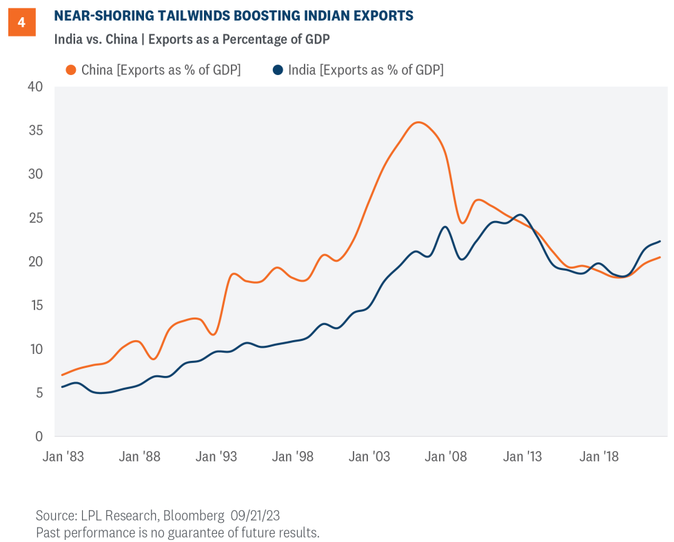 Another factor behind India’s growth has been its increased popularity as a supply source alternative to China, making it a more export-driven country that is less reliant on domestic consumption. The rise of de-globalization following the pandemic and escalating trade tensions between the U.S. and China have made India a near-shoring beneficiary. As shown in Figure 4, India’s exports as a percentage of GDP have climbed to 22.4%, now outpacing China’s exports as a percentage of GDP rate of 20.7%.