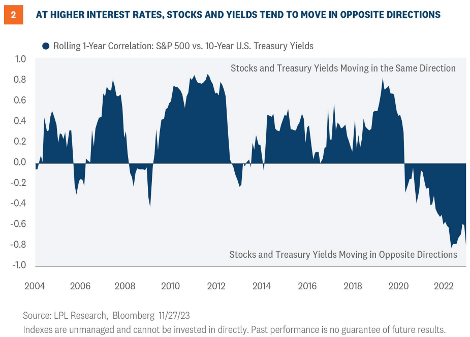 Stocks and bond yields became increasingly negatively correlated (moving in opposite directions) in 2023 (Figure 2), which could present an opportunity for stocks and bonds in 2024. LPL Research expects the 10-year Treasury yield to end 2024 between 3.75% and 4.25%, with potential downside if the U.S. economy slows more than economists currently anticipate.