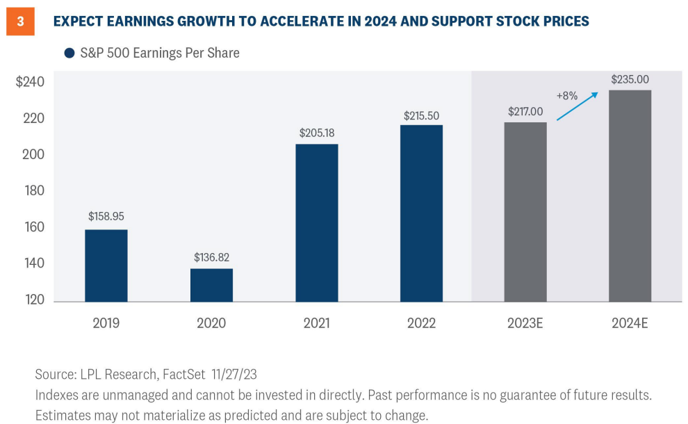 Still, modest economic growth in 2024, in our view, will be sufficient to drive earnings growth in 2024, even if the economy contracts at some point during the year and as long as inflation continues to fall. Our 2024 S&P 500 earnings per share (EPS) forecast is $235 per share, about 7% above the current 2023 consensus S&P 500 EPS estimate of $219 and 8% above LPL Research’s $217 forecast (the long-term historical average earnings growth rate is about 8%, Figure 3).