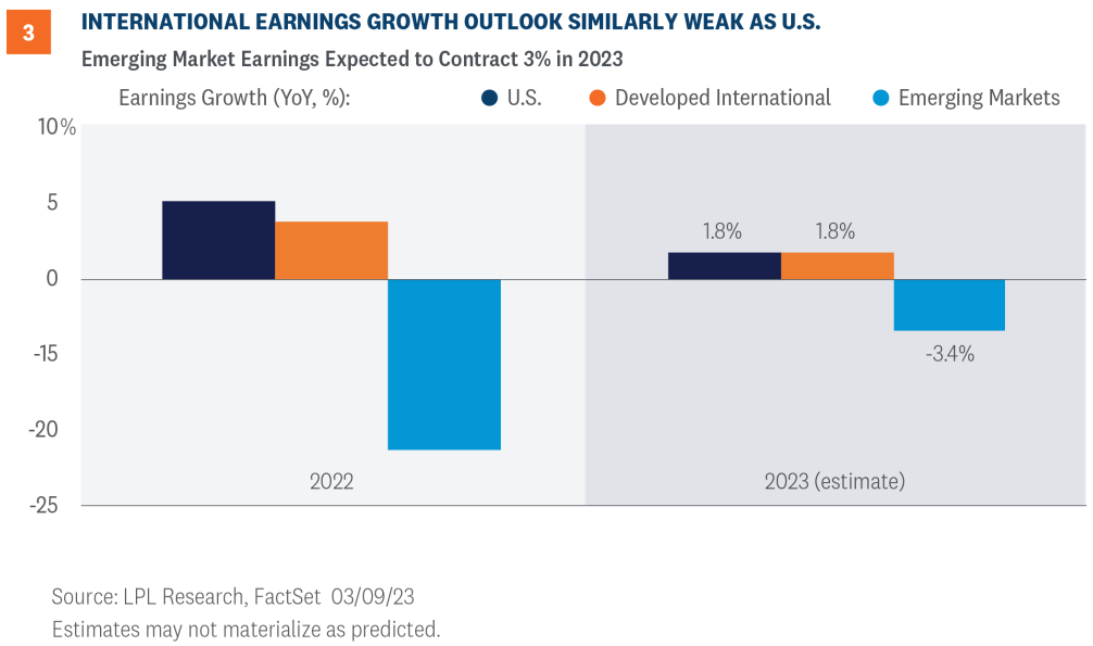 The earnings growth picture suggests a similar outlook for developed international and U.S. equities, as shown in Figure 3. These are just estimates, but consensus currently reflects 1.8% growth in earnings for the S&P 500 and MSCI EAFE indexes. The outlier is emerging markets (EM)—the MSCI EM Index is expected to see a 3.4% decline in earnings in 2023.