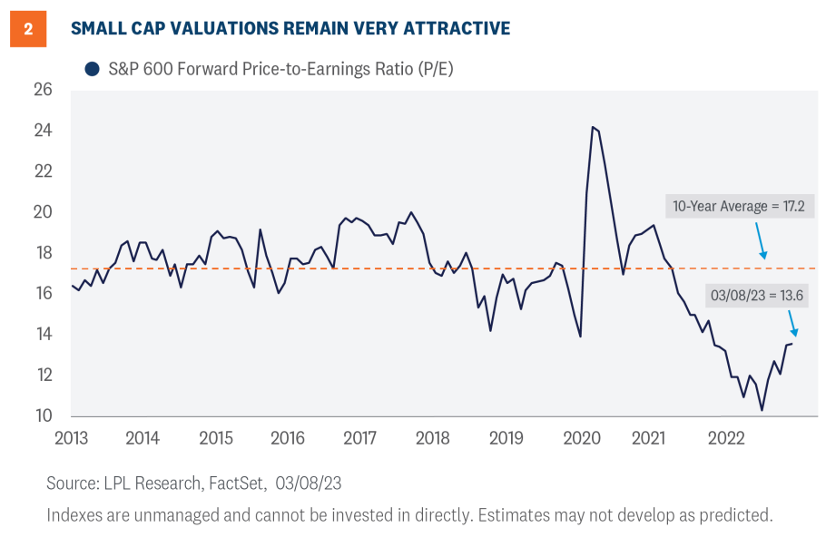 Small caps look cheap enough to us here to favor despite these risks. As shown in Figure 2, the S&P 600 Small Cap Index trades at a 13.6 price-to-earnings ratio (P/E), well below its 10- year average at 17.2. For comparison, the S&P 500 Index trades at a 17.2 P/E, right in line with its 10-year average.