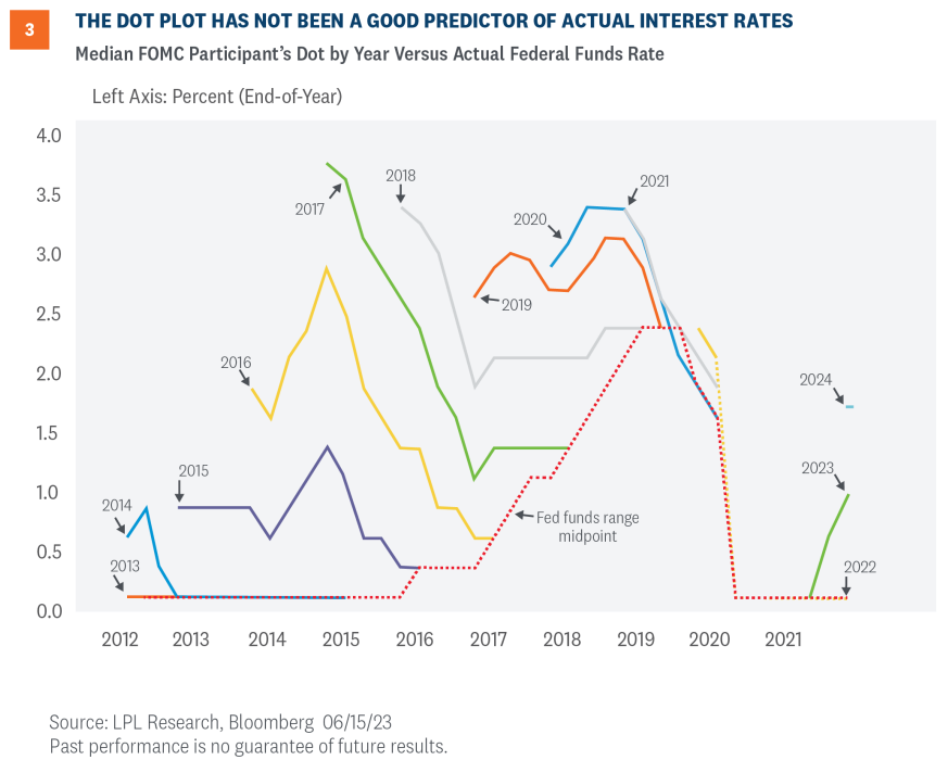 The Fed’s crystal ball is no better than the market’s and we know from history that the dot plot is not a good forecasting tool. As seen in Figure 3, the median forecast rarely, if ever, coordinated with actual policy rates (dashed red line). Dot plot medians tended to overestimate policy rates—sometimes by a wide margin. The most egregious example appears to be in 2015 (green line) when the Committee expected interest rates in 2017 to be above 3.5%, when in actuality they were closer to 0.50% that year. Nonetheless, it is worth watching how these views evolve in the coming months, which means either the Fed lowers its forecasts or the market adjusts higher, putting upward pressure on bond yields.