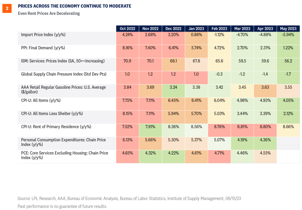 We think the Fed should consider the improving inflation outlook in addition to the other variables and concerns they’ve already stated. The latest Consumer Price Index (CPI) print decelerated toward the lower end of expectations, with overall headline inflation falling to the lowest level since April 2021. The encouraging trend in consumer prices will provide the Fed some leeway throughout the balance of 2023. Investors seem to believe the latest CPI report shows inflation is heading in the right direction and likely reinforced the Fed’s decision to skip a June rate hike or even pause for a longer period. As shown in Figure 1, headline inflation is below the fed funds upper bound, although core inflation is not decelerating as fast as headline inflation.