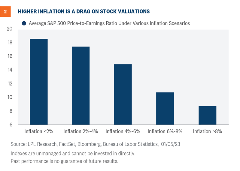 When LPL Research released the Outlook 2022: Passing the Baton in December 2021, the team’s view was that the hit from inflation would be manageable and would therefore limit the number and magnitude of interest rate increases, enable the U.S. economy to avoid recession, and support above-average valuations. Well, the hit from inflation was worse than we anticipated, the Fed was surprisingly aggressive (central bankers were clearly too slow in recognizing the severity of the inflation problem), and interest rates spiked well above our initial forecast. The relationship between inflation and stock valuations is a strong one, as shown in Figure 2, which meant the market could no longer support price-to-earnings (P/E) ratios over 20 (the same goes for the relationship between interest rates and stock valuations). The hit to valuations in the form of about 4 P/E points (21 to 17) translates into a roughly 20% drop in the S&P 500 Index.