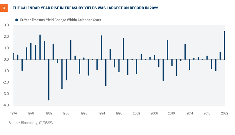 Because of that aggressive rate hiking campaign that took place largely in one calendar year, we saw Treasury yields increase the most in one calendar year on record. The chart below shows the changes in the 10-year Treasury yield on a calendar basis and the 2.4% increase in yield last year was more than any calendar year period on record; even during the 1970s and 1980s when interest rates were significantly higher than today. That upward pressure on yields certainly caused fixed rate coupon paying bonds to sell off dramatically last year, resulting in the worst year on record for core bonds (as measured by the Bloomberg Aggregate Bond Index).