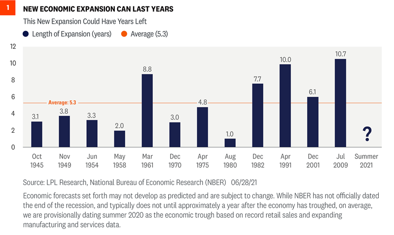 We continue to watch inflation closely but believe recent price pressures are transitory and will begin to work their way off gradually later in the year. As shown in [Figure 1], the average U.S. expansion since World War II has lasted five years and much longer over the last few decades. There’s nothing on the horizon to indicate the current expansion can’t reach that mark.