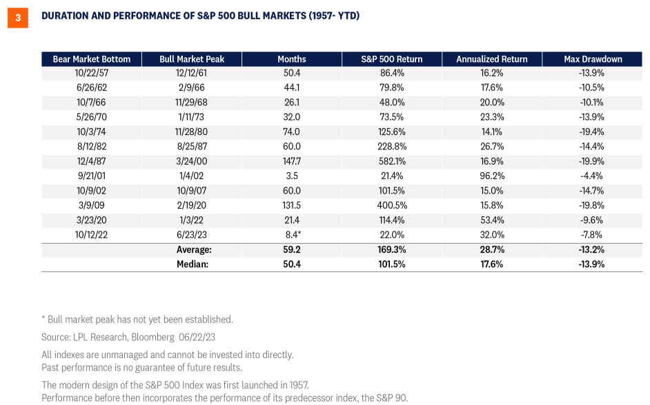We know it’s old news at this point, but on June 8, 2023, the S&P 500 entered a new bull market. After such a strong rally off the October lows, this young bull probably needs a breather. A look at the charts suggests this market may be due for a pause. Bull markets are not linear. However, the impending end of the Federal Reserve (Fed) rate-hiking campaign, and the economy’s and corporate America’s resilience, help make the bull case that steers LPL Research toward a neutral, rather than negative, equities view from a tactical asset allocation perspective.
