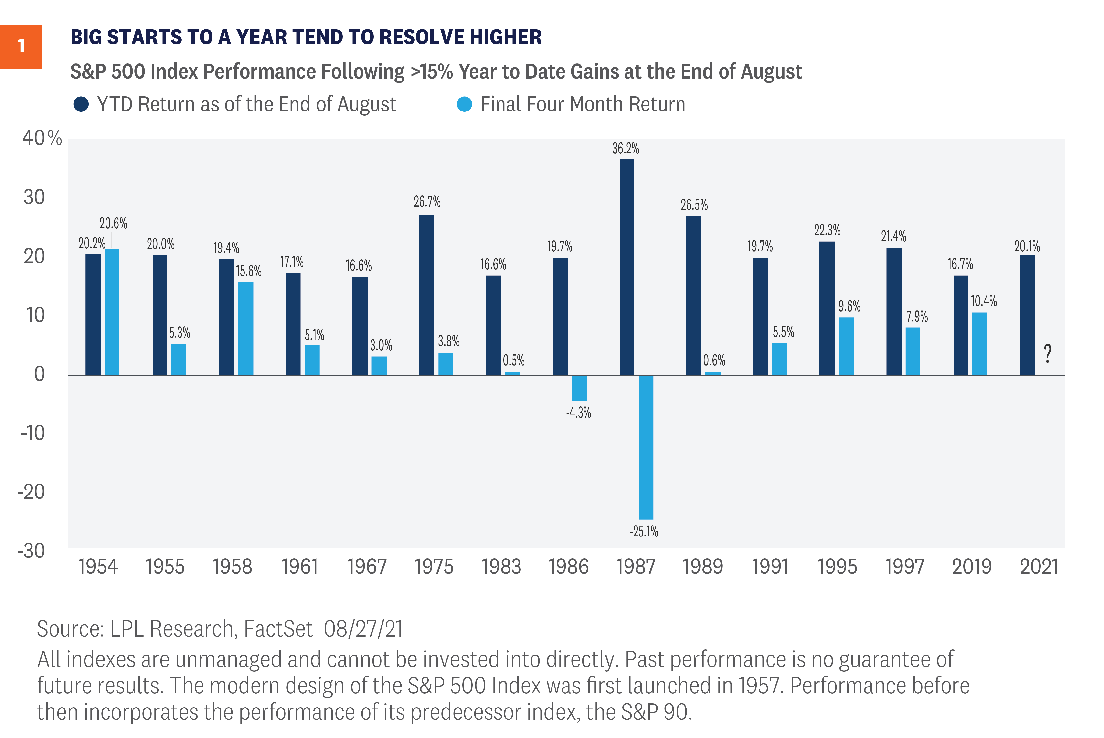 What should investors do now? One of the common bear worries is stocks moving up a lot means stocks will come down a lot. That simply isn’t true, fortunately. In fact, as [Figure 1] shows, when the S&P 500 is up more than 15% year to date at the end of August (as 2021 likely will be), the final four months have been up the past five times, with the last three up 9.6%, 7.9%, and 10.4%, respectively. In fact, the average return in the final four months after a great start to the year is 4.2%, with a very impressive median return of 5.2%. Both numbers are above the average, and the median return for all years during the final four months is 3.6%.