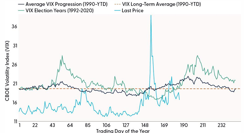 Now that the 0.25% vs. 0.50% debate has been settled, policy discussions are shifting toward the upcoming presidential election. In our Midyear Outlook 2024: Still Waiting for the Turn, we expressed our belief that volatility would likely increase in the second half, potentially around election-related policy uncertainty (geopolitical threats or an unexpected reacceleration in inflation were also cited as risks). We still hold this viewpoint, though inflation risks appear well contained at this point.