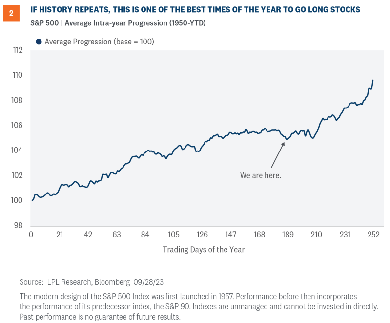 After a difficult September for stocks, investors are surely ready to flip the calendar to October. That’s the month that kicks off the historically strong fourth quarter. Expecting this pattern to repeat this year is tricky given the overhang of a government shutdown, interest rates near 16-year highs, a market still trying to digest the Federal Reserve’s “higher for longer” message, and a consumer who is facing some stiff headwinds as excess savings are drawn down, student loan payments restart, and the effects of higher borrowing costs are increasingly felt. Amid that complicated backdrop, here we assess prospects for a fourth-quarter rally.