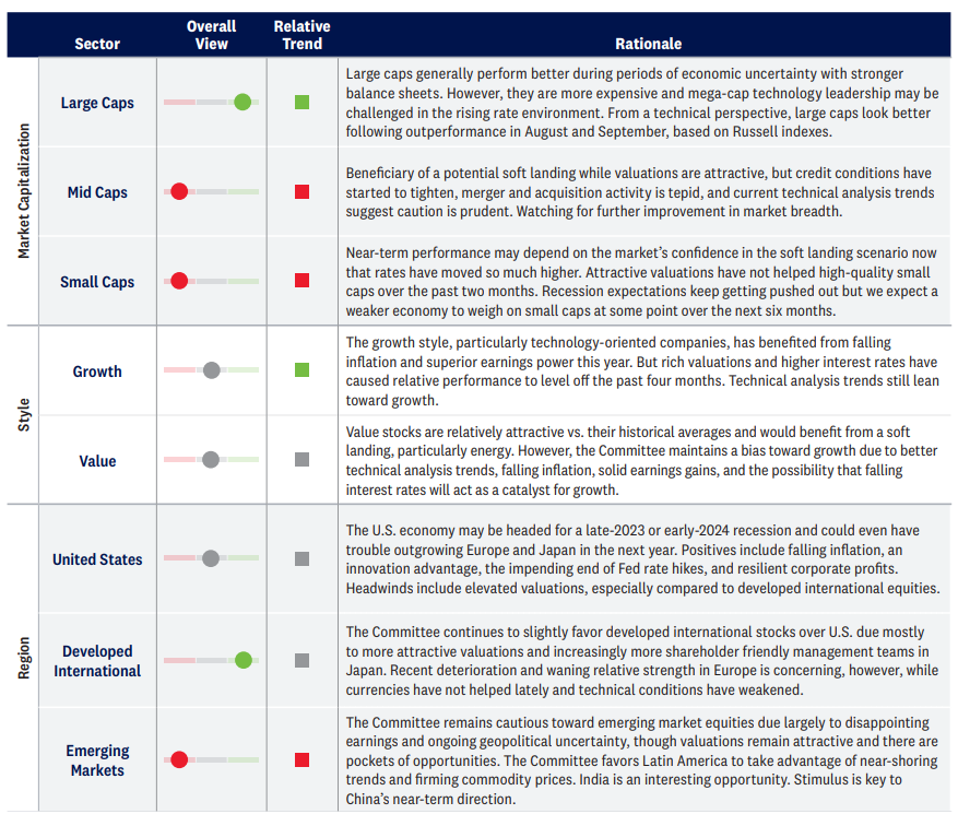 • The Committee favors large cap stocks over their smaller brethren ahead of a likely economic slowdown toward the end of the year.