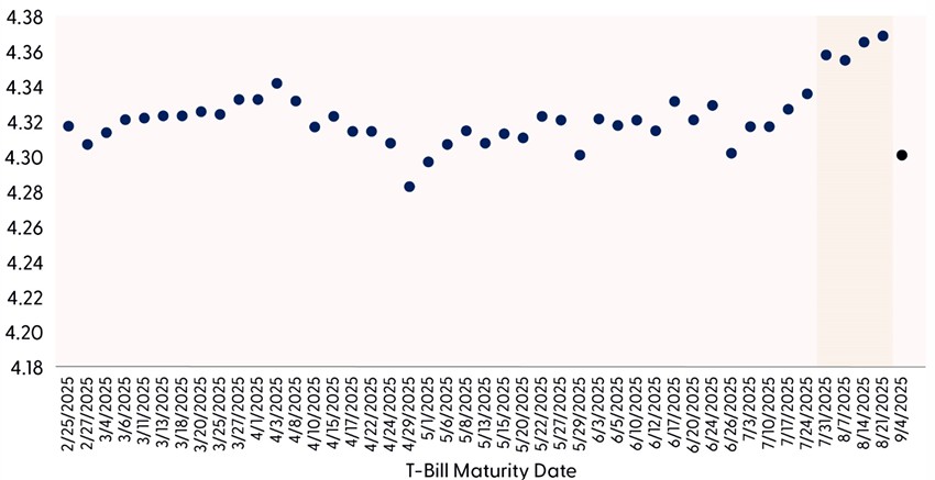 The current market pricing suggests investors are treating late July/early August as the potential “X-date” — the point at which the Treasury would exhaust its extraordinary measures without congressional action. Bills maturing during this period are yielding around 4.35–4.38%, notably higher than surrounding maturities, indicating a risk premium of several basis points. This “kink” in the T-bill curve might seem small, but in the nearly $7 trillion T-bill market, it represents significant concern about another partisan standoff. Given the current political climate and narrow House majority, markets appear to be bracing for another round of brinksmanship, even though history suggests Congress will ultimately act to prevent a default.