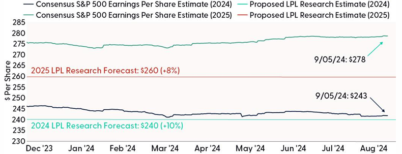 These positive factors are offset by a slowing U.S. economy, which limits revenue growth opportunities. A sluggish Chinese economy is weighing on revenue growth for some sectors, particularly natural resources. And as more consumers potentially get more strapped — we have heard from several discount retailers and dollar stores that this has already started to occur — they will push back more on high prices. These headwinds suggest estimates by Wall Street are too high. LPL Research maintains its below-consensus S&P 500 EPS forecasts for 2024 and 2025 at $240 and $260, representing growth of 10% and 8%, respectively.