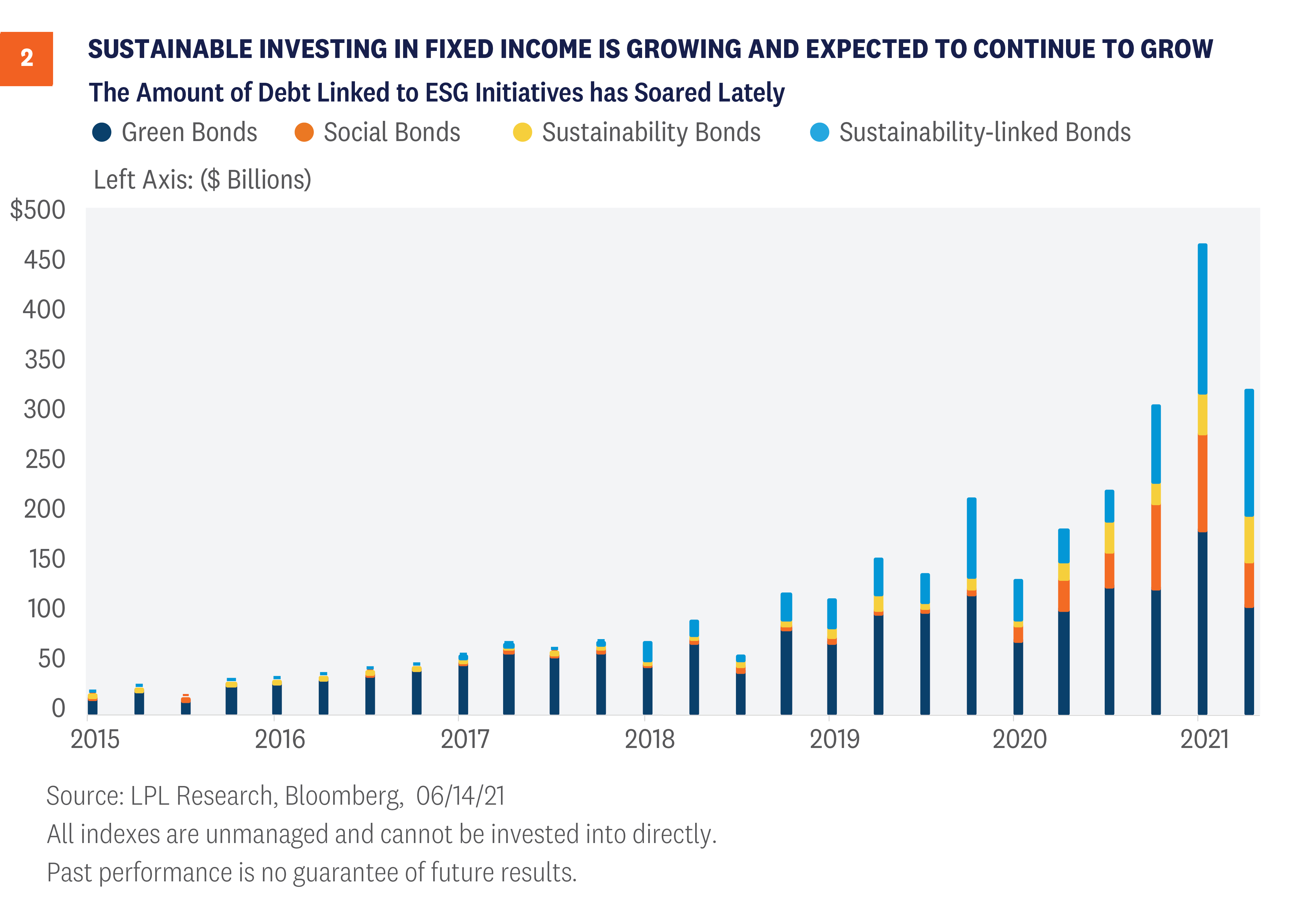 As seen in [Figure 2], the data certainly seems to back up our current thinking. Since 2015, the amount of debt linked to ESG projects has continued to grow. For the entirety of 2015, debt issued to support ESG projects totaled around $80 billion. Now, we’re seeing multiplies of that every quarter! Over $400 billion of ESG related debt was issued in the first quarter of 2021 alone.