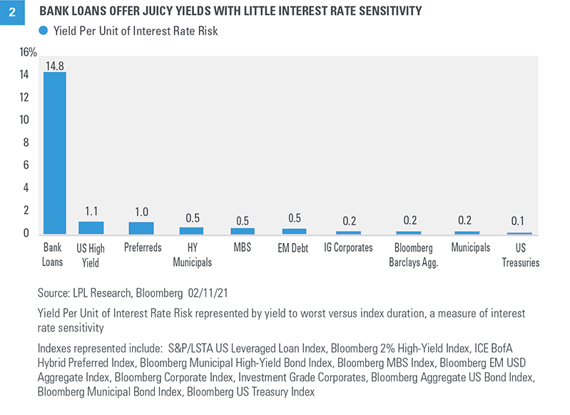 [FIGURE 2] ranks the major fixed income sectors by income per unit of interest rate risk. Since fixed income indexes have different degrees of interest rate sensitivity, this exercise allows us to determine compensation for taking on interest rate risk. Bank loans are an obvious standout by this measure, offering potential yields in the 4% range with extremely low interest rate sensitivity.