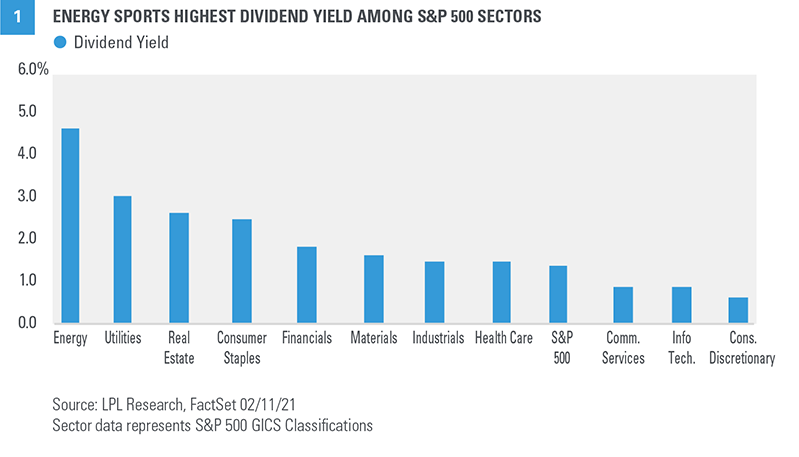 The first idea is energy stocks. You may be surprised to learn that the energy sector currently yields about 5% based on dividends paid in 2020, topping all S&P 500 sectors [FIGURE 1]. In this month’s Global Portfolio Strategy report, we upgraded our view of the energy sector to neutral. Our increased optimism was driven primarily by three factors. First, as we get closer to a fully reopened economy and travel activity picks up—potentially in the second half of this year—energy is likely to be a big beneficiary. Second, our technical analysis work revealed attractive upside potential based on recent price appreciation after an extended period of weakness. Third, we see the sector as attractively valued, especially when considering the income potential.