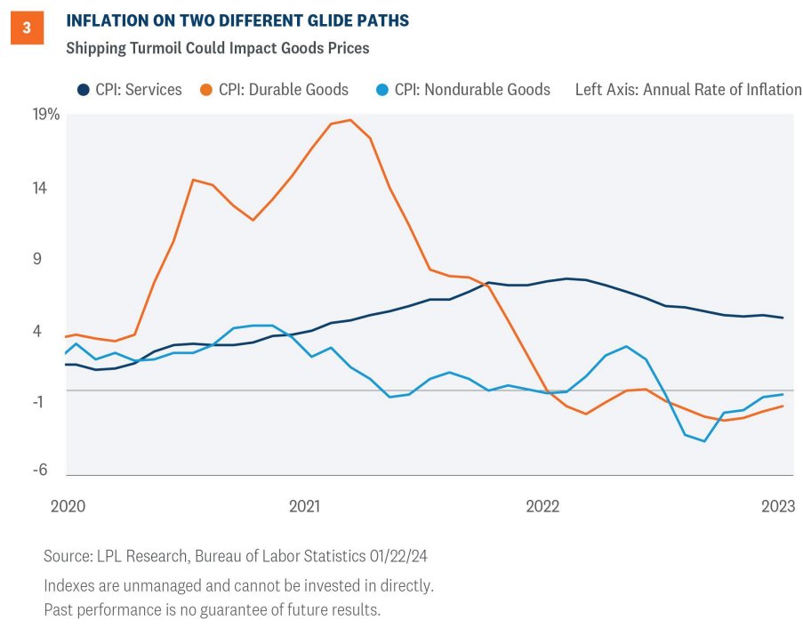 So why is the current problem different? Right after the start of the pandemic, firms struggled to set market-clearing prices, and many initially thought inflation was transitory, a forecast that ended embarrassingly. However, since the beginning of 2023, the annual rate of inflation for durable goods was negative (Figure 3). So, although supply disruptions will likely bring upward pressure on goods prices, we don’t think the temporary shock will change the Fed’s pivot from hiking rates to cutting rates. And if the data supports it, we could see the first cut in March.
